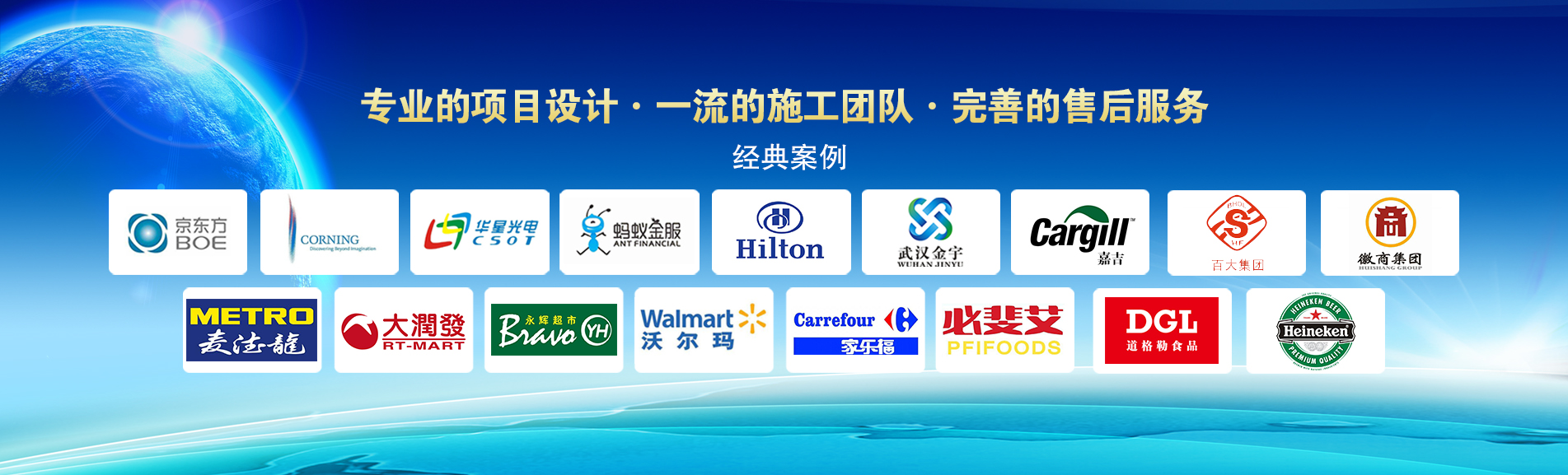 冷凍冷藏設(shè)備大型冷庫(kù)項(xiàng)目: 武漢中百物流冷庫(kù)(40000㎡)、蘇州、北京普洛斯大型物流庫(kù)(17000㎡)、沈陽(yáng)佳德物流冷庫(kù)(20000㎡)、上海東航配餐物流庫(kù)(6000㎡)、杭州華商勾莊物流冷庫(kù)(24000㎡)、安徽安心蔬菜綠色食品冷庫(kù)(12000㎡)、武漢金宇冷庫(kù)(35000㎡)、必斐艾食品廠(chǎng)(14000㎡)、中國(guó)-東盟(百色)農(nóng)產(chǎn)品交易中心冷庫(kù)物流工程(30000㎡)、遵鐵物流冷鏈物流區(qū)建設(shè)項(xiàng)目中心冷庫(kù)物流工程(16500㎡)、長(zhǎng)沙云冷產(chǎn)業(yè)園冷庫(kù)物流工程(21000㎡)等;大型中央空調(diào)項(xiàng)目: 武漢康寧顯示玻璃廠(chǎng)廠(chǎng)房、武漢京東方模組廠(chǎng)房、武漢華星光電模組廠(chǎng)房、深圳華星光電模組廠(chǎng)房,杭州阿里巴巴辦公樓,舟山波音737機(jī)場(chǎng)辦公樓,南京江北能源站、上海金融大酒店等